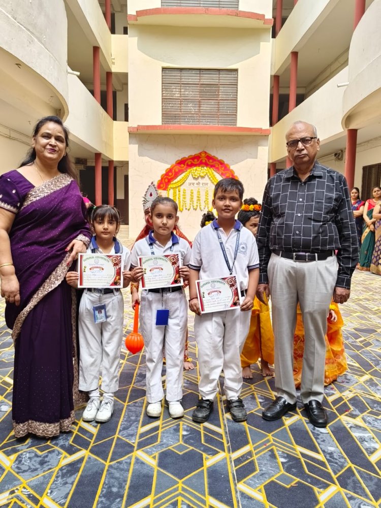 शुभारम्भ प्रबंधक मुकेश गुप्ता और प्रधानाचार्या प्रभा सिंघल ने किया। बच्चों ने मुख्य द्वार, रिसेप्सन, आफिस की साफ सफाई की। रंगबिरंगी झालरों से सुसज्जित किया। रंगौली, दीया और मटकी की डेकोरेशन में भाग लिया। दीवाली पर वनो से घर लौटे राम लक्ष्मण सीता के साथ हनुमान की झांकी ने मन मोह लिया। राम बने चिराग, लक्ष्मण बने अक्ष त्यागी, सीता बनी लावण्या और हनुमान बने वीर धामा ने शानदार अभिनय किया। दीया डेकोरेशन में अक्षित, आरव, रितविका और हर्षित प्रथम रहे। गुनगुन, निकुंज, विराज और आरव द्वितीय रहे जबकि नित्या, स्कंद, दिव्यांश, देवांशी और यूरवी तृतीय रहे। मटकी प्रतियोगिता में शाविका, अनुश्री और अवनी प्रथम, युष्टी, वंशिका और प्रियांशी द्वितीय, रिधिमा, वर्षा, खुशी, दिली और अंशिका तृतीय रहे। प्रतियोगिताओं के विजेताओं को सम्मानित किया गया। संचालन में उप प्रधानाचार्या राखी झा, महिमा, शिवांगी, पूर्णिमा, जूली, राखी, भारती, रेशु, सरिता, रेनू समेत शिक्षिकाओं को योगदान रहा।